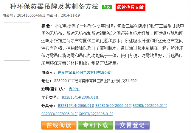 本發(fā)明提供了一種環(huán)保防霉吊牌,包括二層銅版紙和設(shè)有二層銅版紙中間的無紡布,所述無紡布和所述銅版紙之間還設(shè)有吸水纖維;所述銅版紙和所述吸水纖維之間涂布有固體二氧化氯和膠水;所述吸水纖維和所述無紡布之間涂布有香精,植物精油以及分子篩和膠水;各層通過膠水粘結(jié)在一起。所述環(huán)保防霉吊牌將防霉和吊牌的功能集于一體,使用方便,防霉效果好,所述吊牌采用環(huán)保無毒的材料制成,制備方法簡單。